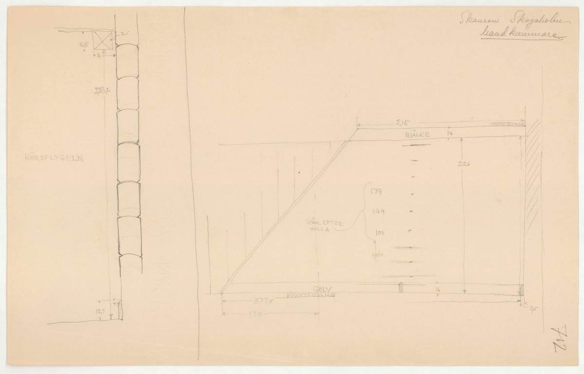 Titel: Skogaholms herrgård. Huvudbyggnaden. Detaljritning. Handkammare (?)