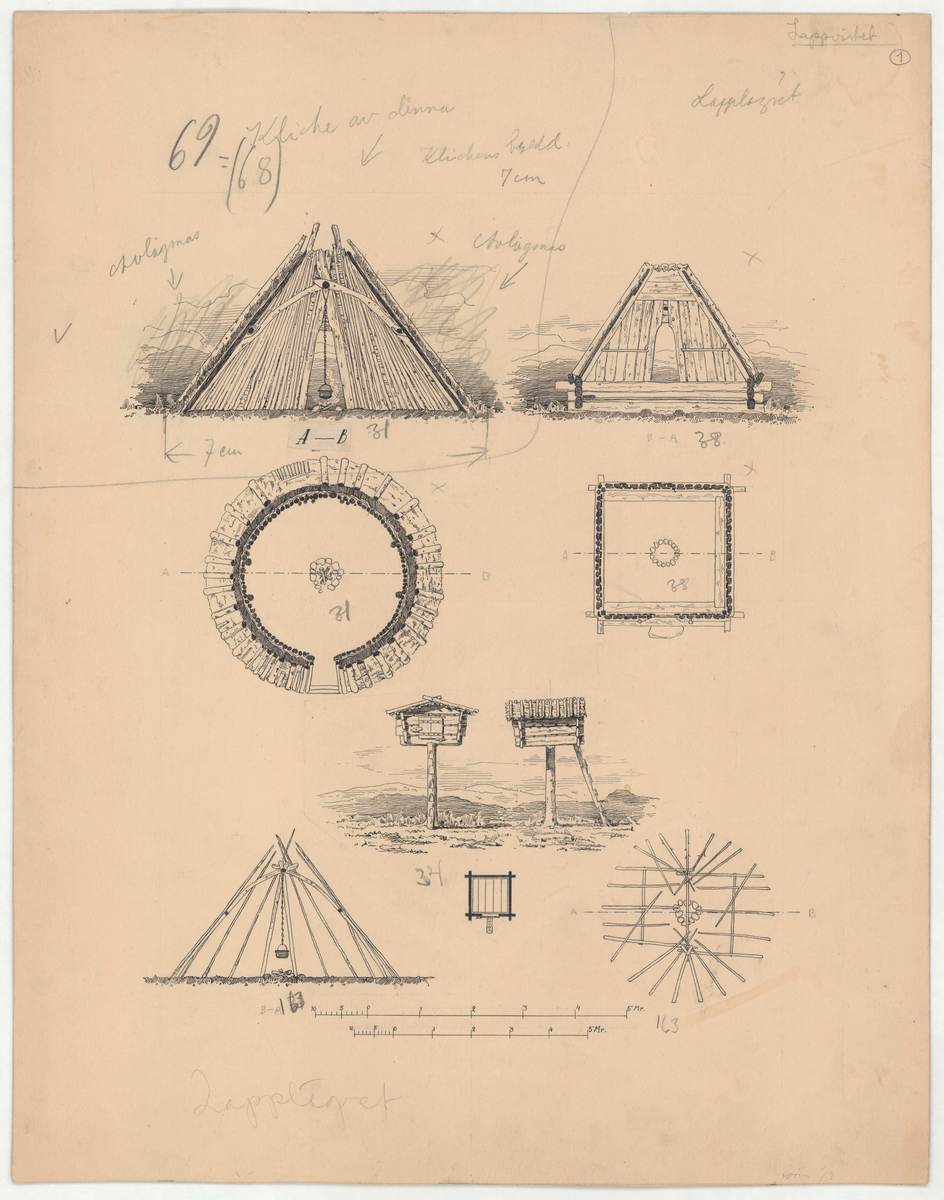 Titel: Saemien Sijte. Samevistet. Sektionsritning. Lappvistet. Lapplägret.