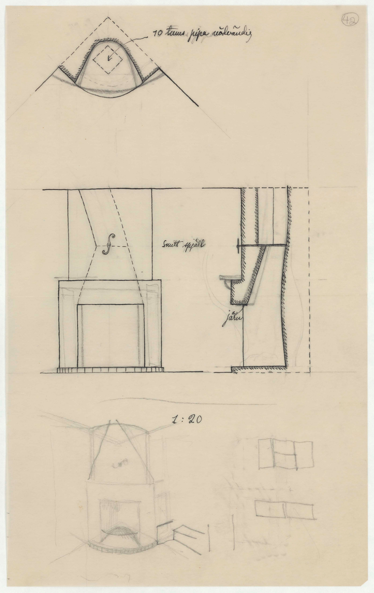 Titel: Skogaholms herrgård. Huvudbyggnaden. Detaljritning. 10 tums pipa nödvändig (?) Smitt spjäll.