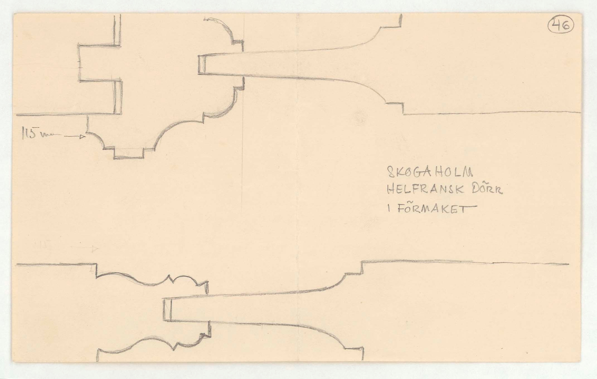 Titel: Skogaholms herrgård. Huvudbyggnaden. Detaljritning. Helfransk dörr i förmaket.