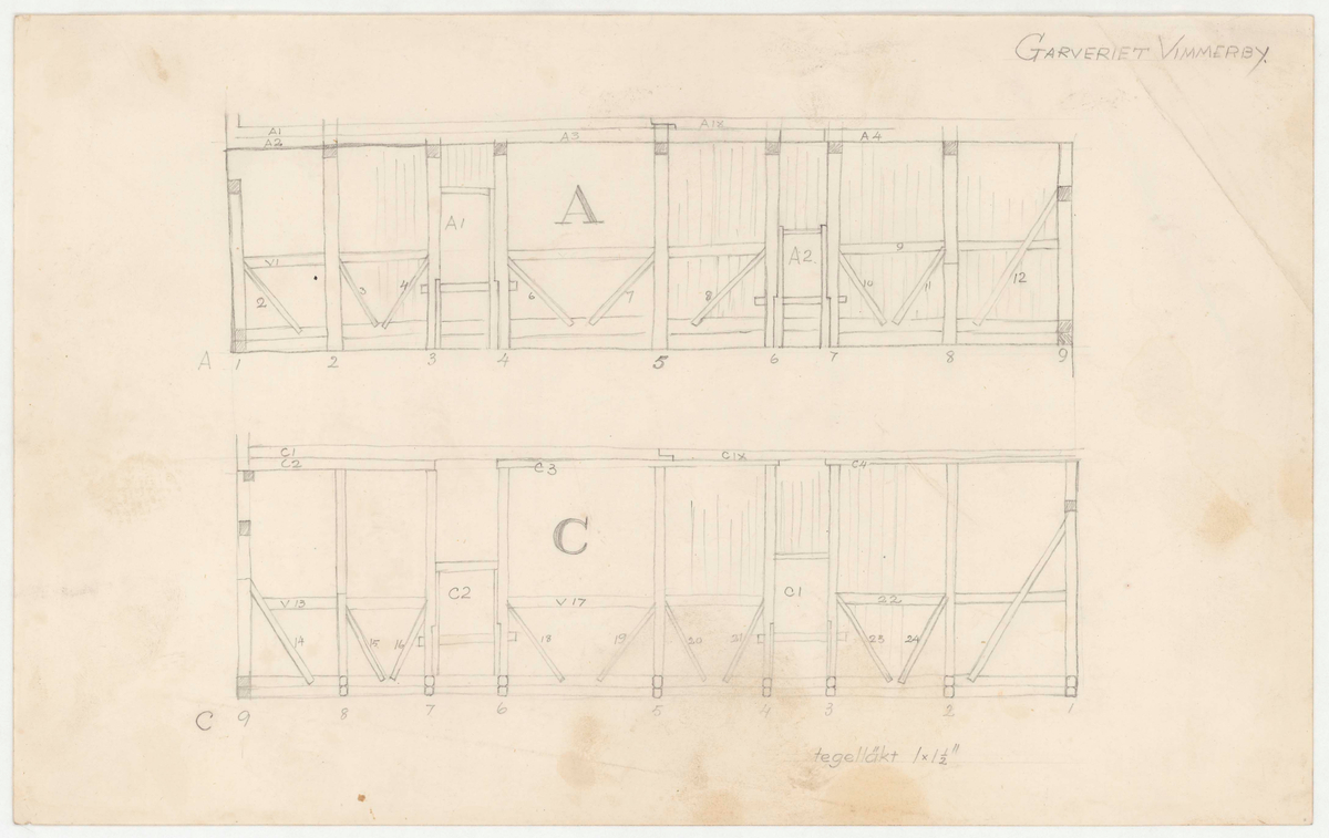 Titel: Garveriet. Uppmätningsritning. Vägg A och C.