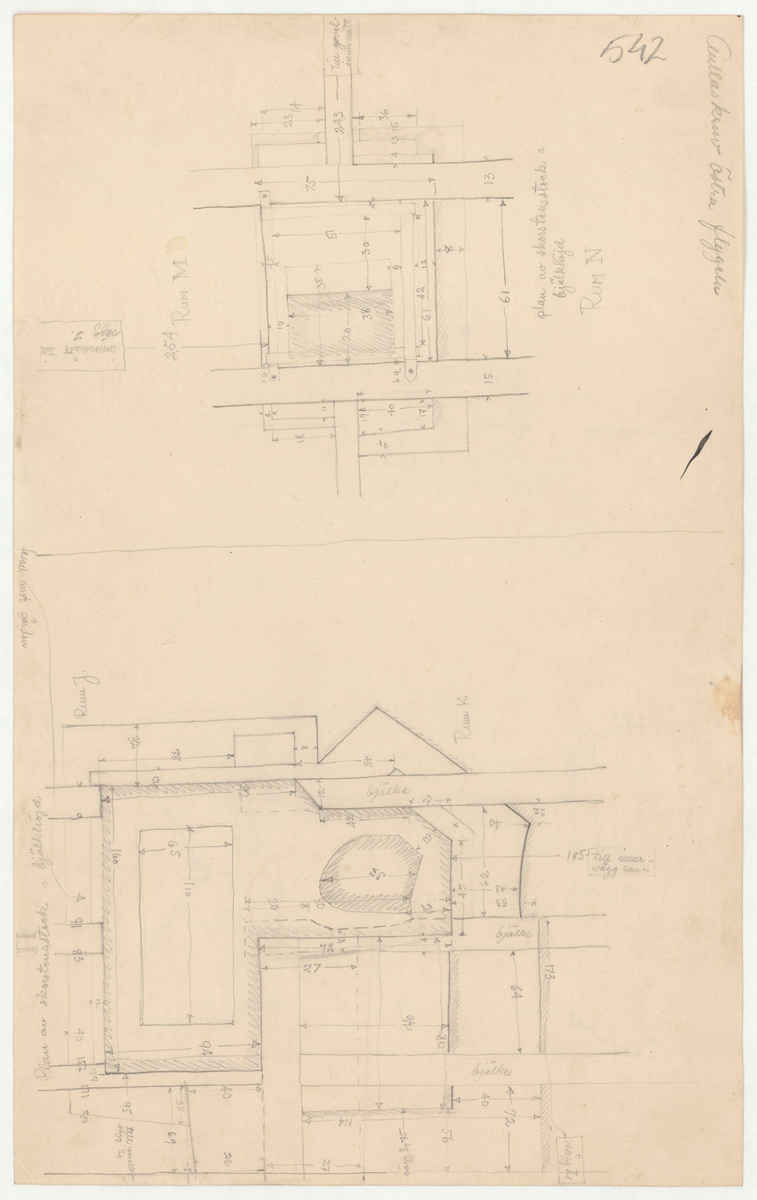 Titel: Skogaholms herrgård. Köksflygeln. Planritning. Östra flygeln. Plan av skorstensstock och bjälklag.
