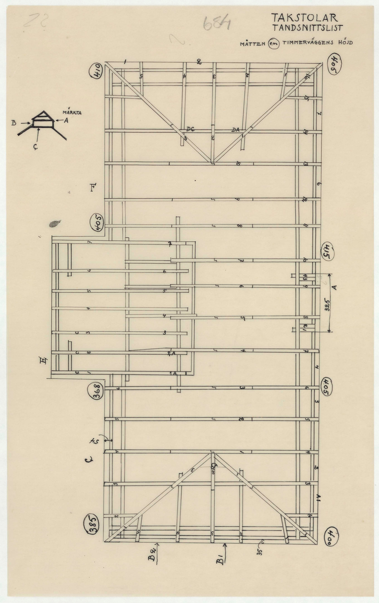 Titel: Skogaholms herrgård. Huvudbyggnaden. Detaljritning. TAKSTOLAR. TANDSNITTSLIST.