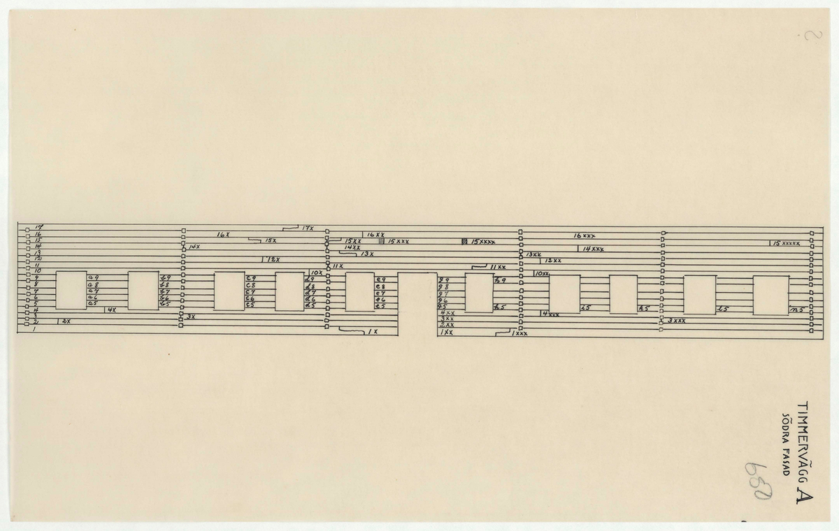 Titel: Skogaholms herrgård. Huvudbyggnaden. Fasadritning. TIMMERVÄGG A. SÖDRA FASAD.