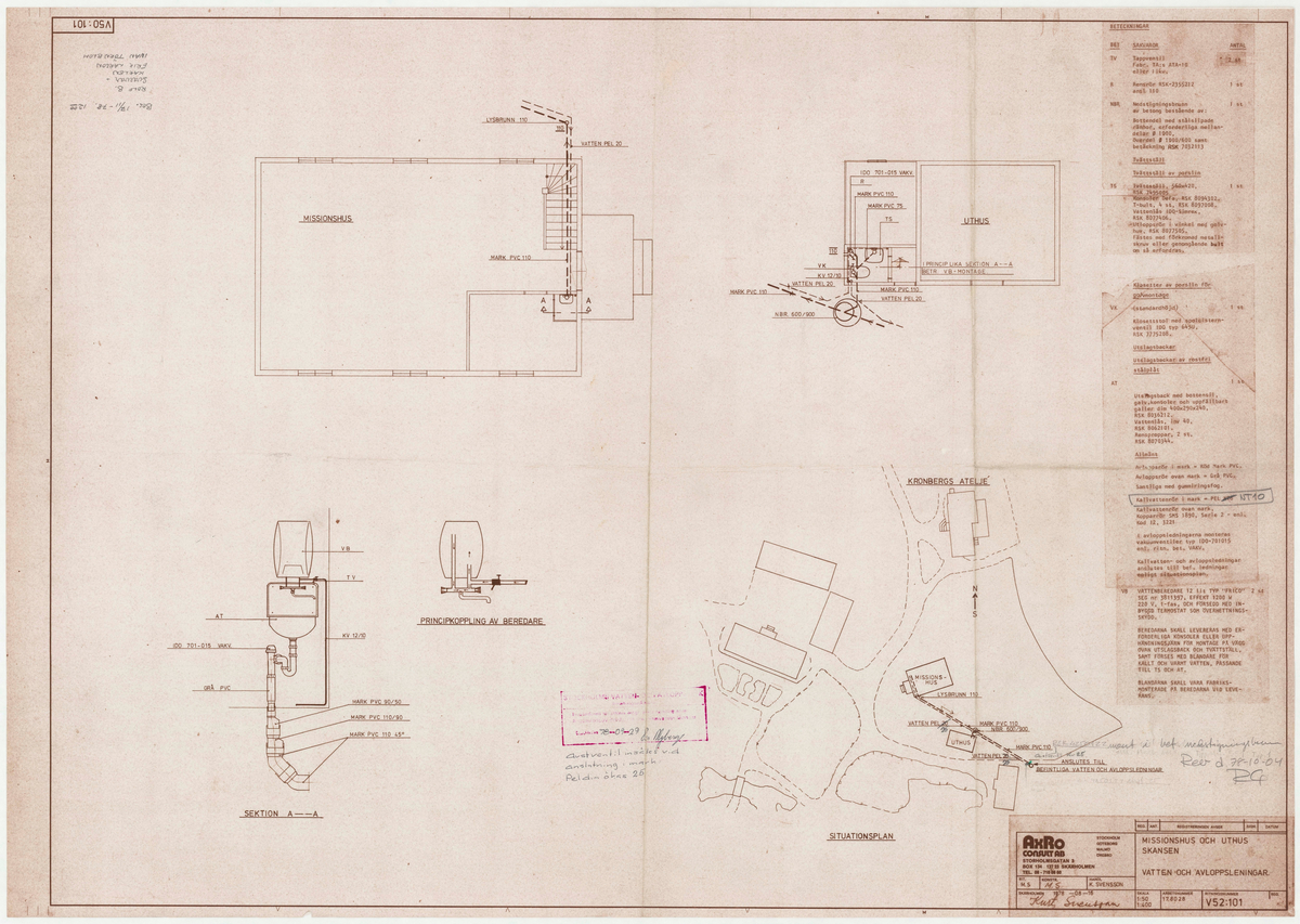 Titel: Missionshuset. Planritning. Situationsplan. Vatten- och avloppsritningar.