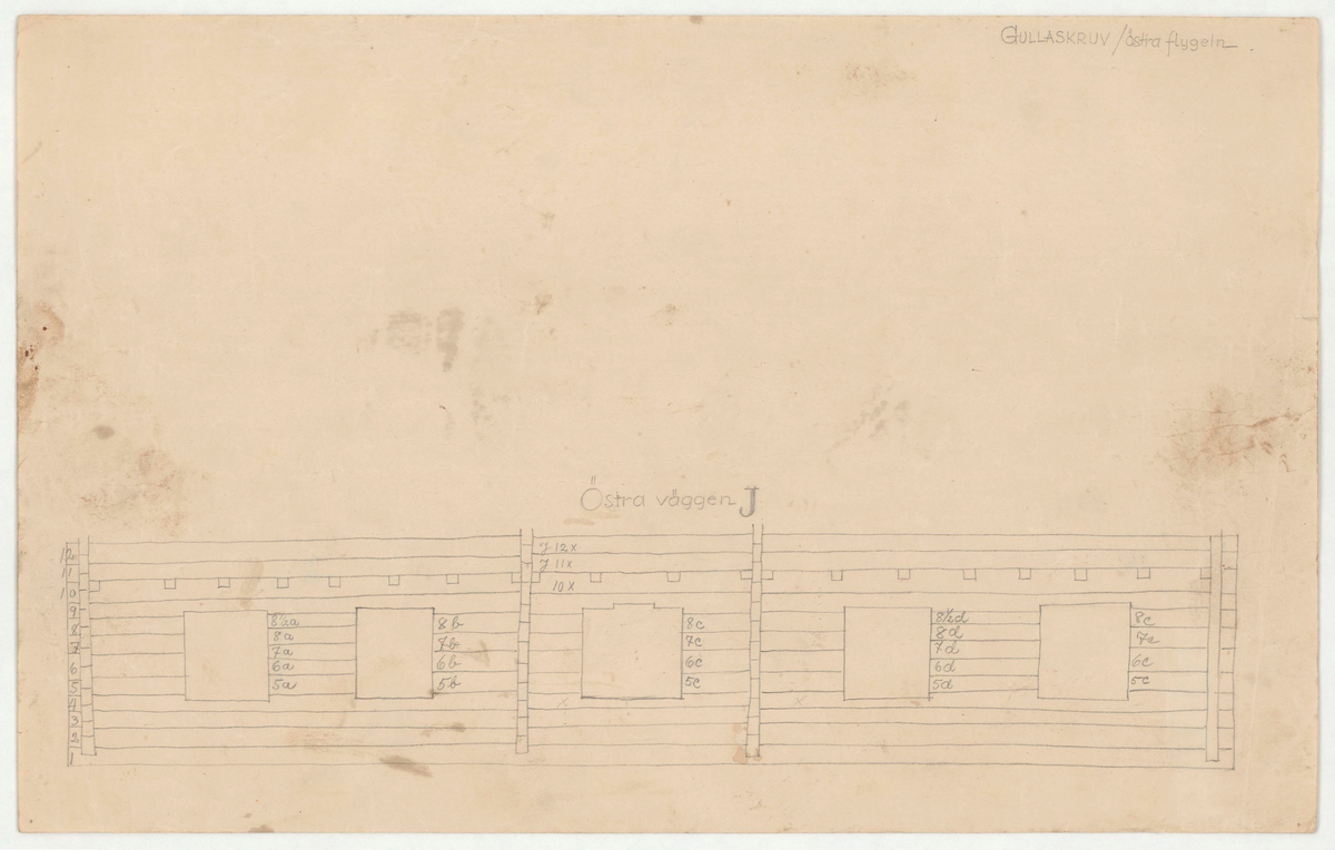 Titel: Skogaholms herrgård. Köksflygeln. Detaljritning. GULLASKRUV/Östra flygeln. ÖSTRA VÄGGEN J.