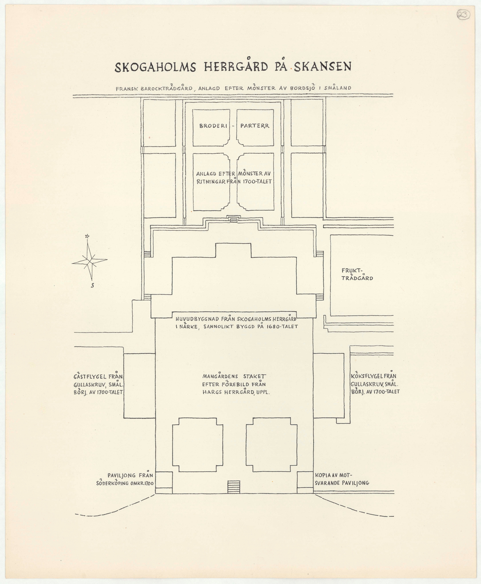 Titel: Skogaholms herrgård. Situationsplan. FRANSK BAROCKTRÄDGÅRD, ANLAGD EFTER MÖNSTER AV BORDSJÖ I SMÅLAND. BRODERIPARTERR ANLAGD EFTER MÖNSTER AV RITNINGAR FRÅN 1700-TALET. HUVUDBYGGNAD FRÅN SKOGAHOLMS HERRGÅRD I NÄRKE, SANNOLIKT BYGGD PÅ 1680-TALET. GÄSTFLYGEL OCH KÖKSFLYGEL FRÅN GULLASKRUV, SMÅLAND. BÖRJAN AV 1700-TALET. MANGÅRDENS STAKET EFTER FÖREBILD FRÅN HARGS HERRGÅRD, UPPLAND. PAVILJONG FRÅN SÖDERKÖPING OMKR. 1700. KOPIA AV MOTSVARANDE PAVILJONG.