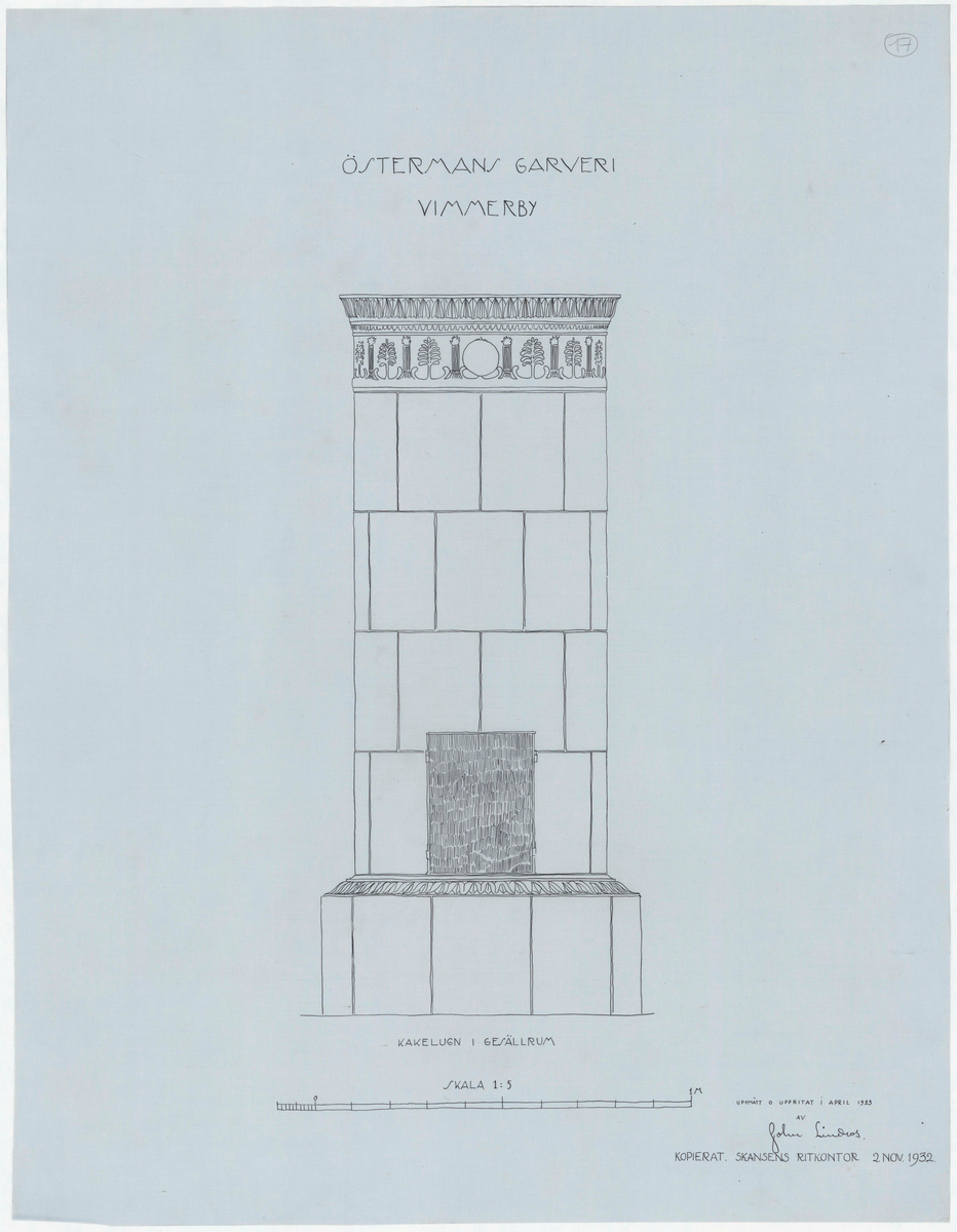 Titel: Garveriet. Profilritning. Kakelugn i gesällrum.