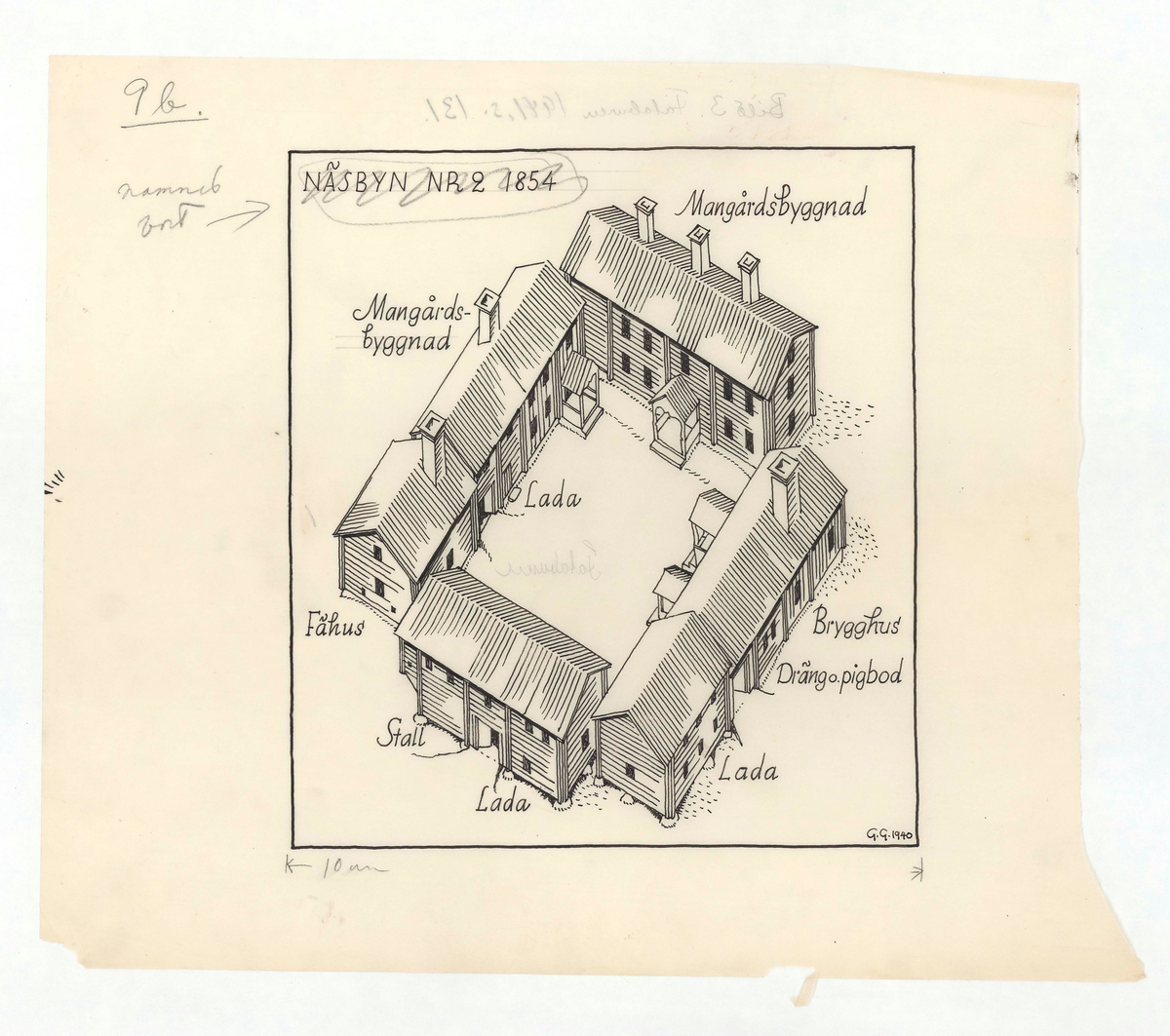 Titel: Delsbogården. Situationsplan (fågelperspektiv). Näsbyn nr 2 1854.