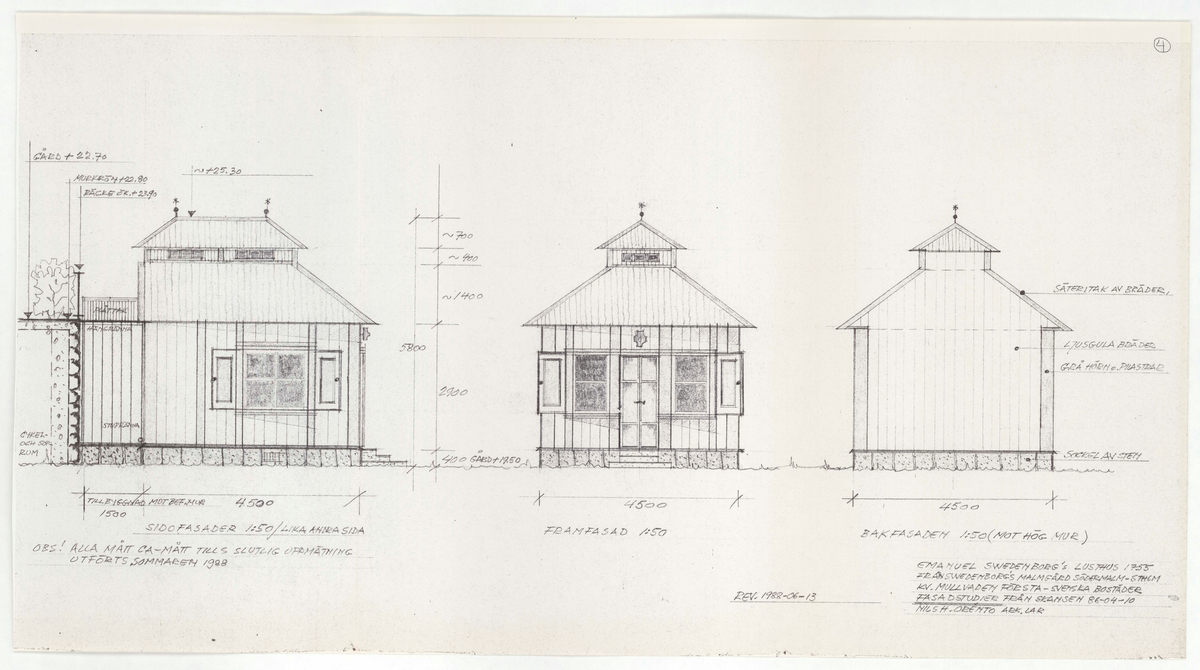 Titel: Swedenborgs lusthus. Fasadritning. Sidofasader. Framfasad. Bakfasad.