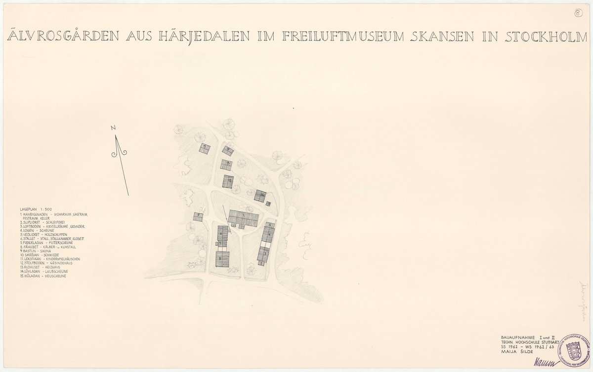 Titel: Älvrosgården. Situationsplan. Byggnadernas beteckningar översatta till tyska.
