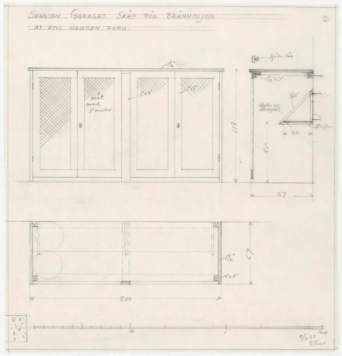 Titel: Apoteket/Petissan. Planritning. Garaget. Skåp för brännoljor.