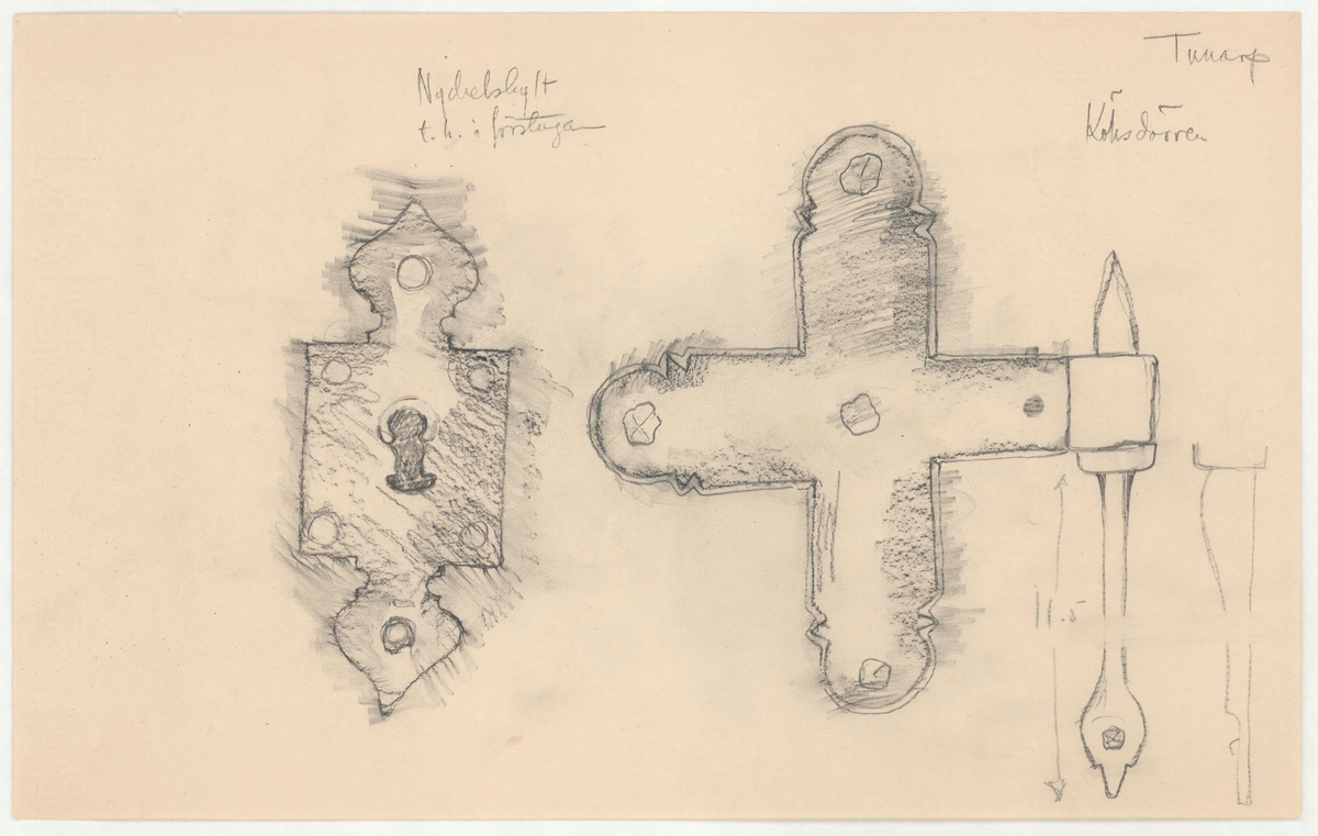 Titel: Skogaholms herrgård. Detaljritning. Nyckelskylt th i förstugan. Köksdörren.