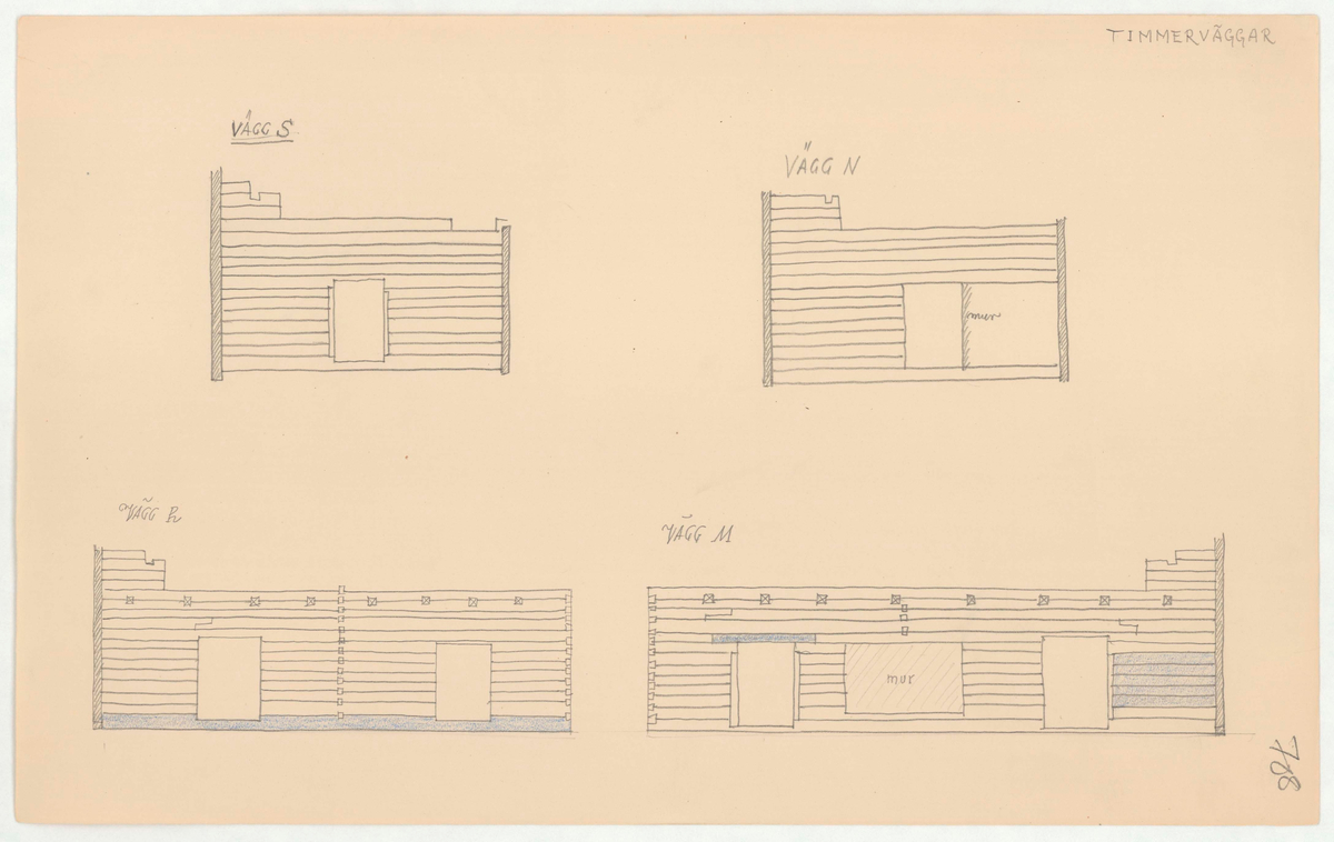 Titel: Skogaholms herrgård. Huvudbyggnaden. Fasadritning. VÄGG S. VÄGG N. VÄGG R. VÄGG M.