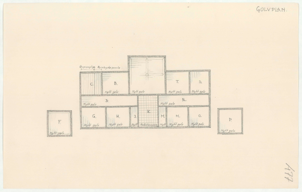 Titel: Skogaholms herrgård. Huvudbyggnaden. Planritning. Golvplan.