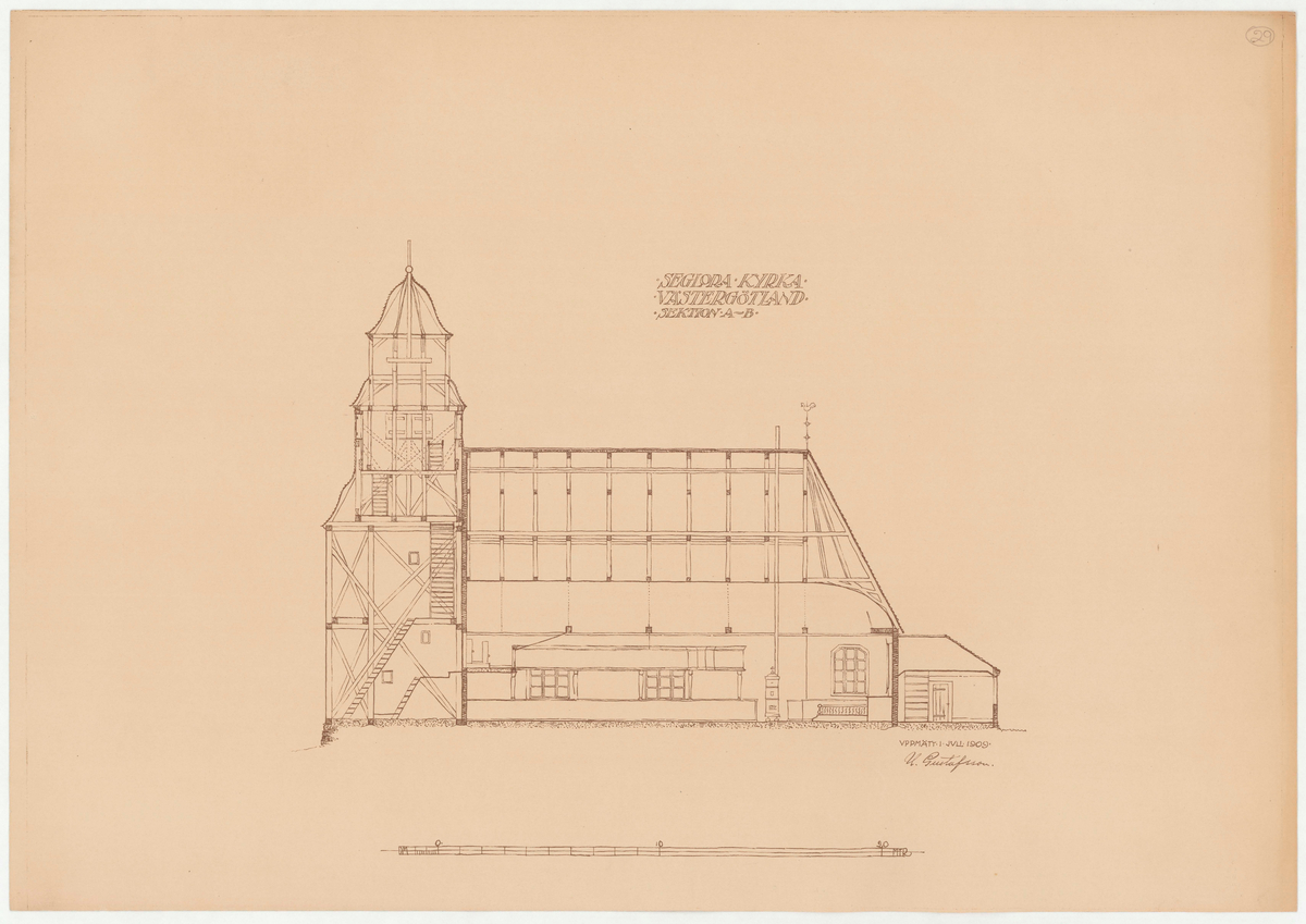Titel: Seglora kyrka. Ursprungsplatsen i Västergötland. Sektionsritning. Sektion A-B.