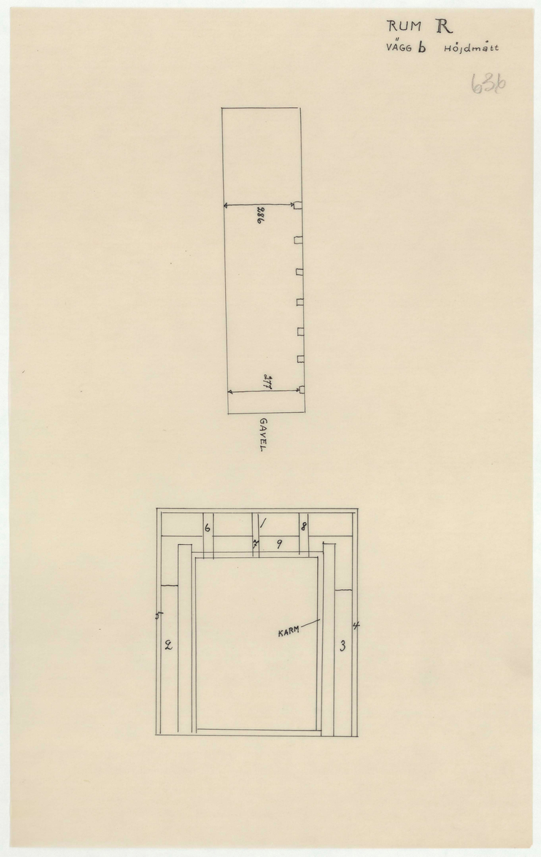 Titel: Skogaholms herrgård. Huvudbyggnaden. Detaljritning. RUM R. Vägg b. Höjdmått.