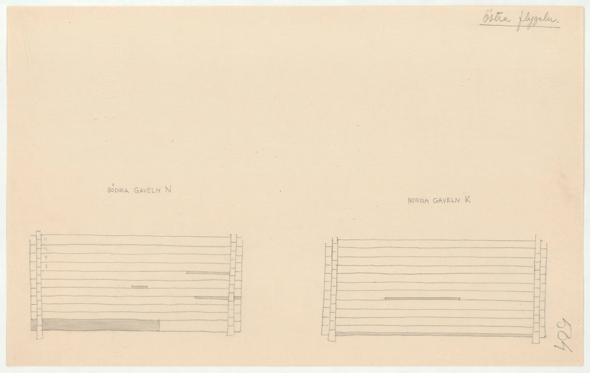 Titel: Skogaholms herrgård. Köksflygeln. Detaljritning. Östra flygeln. SÖDRA GAVELN N. NORRA GAVELN K.