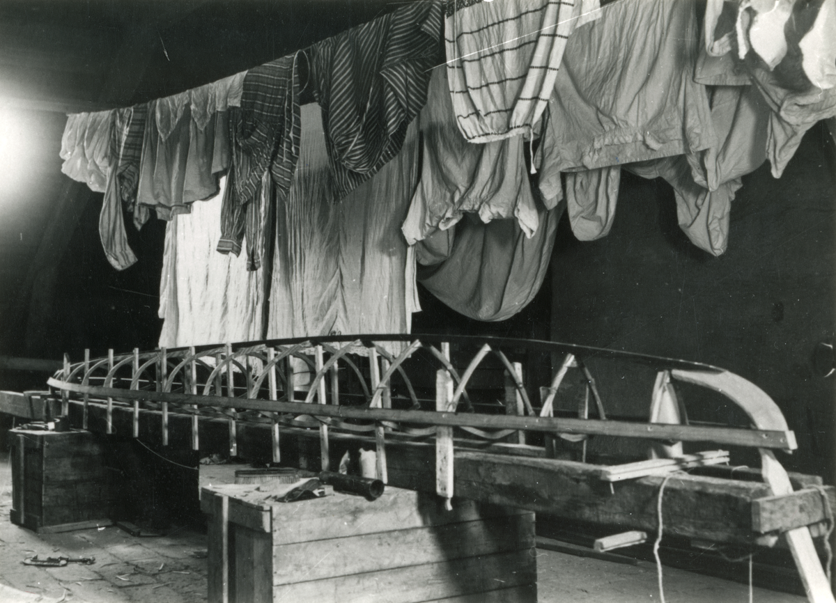 Torkvinden på Storgatan 56, byggnadsplats för en hel del kanoter. På bilden en "lada"-kanot under byggnad för Gunnar Gahm, Troligen 1913. Jämför Fo56432A.