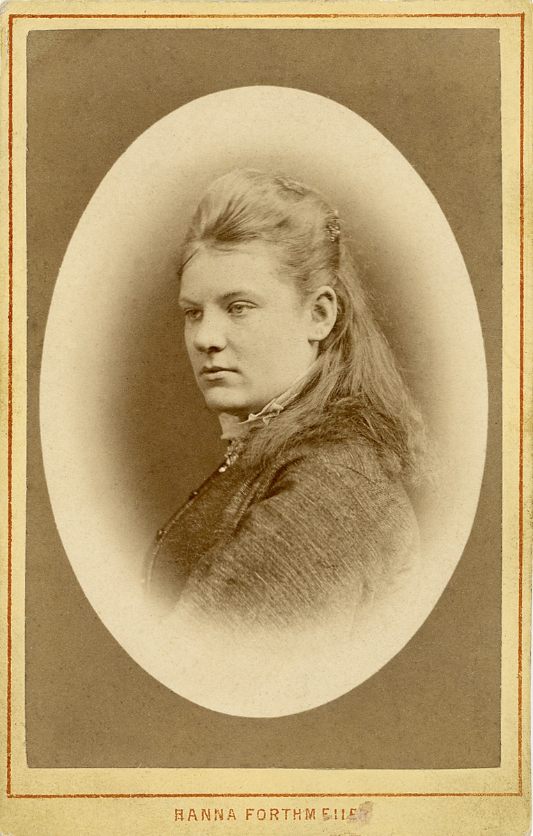 En ung kvinna i mörk klänning med ståkrage. I halsgropen skymtar en brosch.