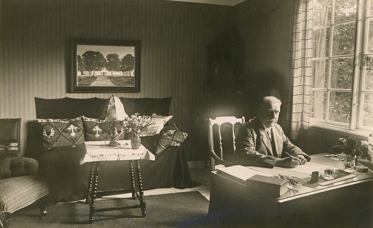 En medelålders man i kostym sitter vid skrivbordet i sitt arbetsrum. På väggen ovanför soffan hänger en s.k. "gåramålning" av barndomshemmet, gården Berg i Slätthög.