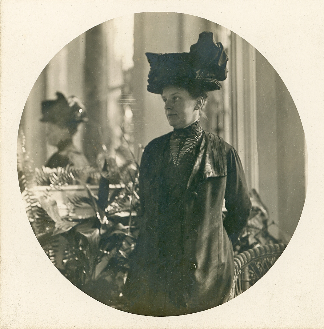 En kvinna i hatt och höghalsad mörk dräkt poserar vid en spegel. Bad Kissingen (?).