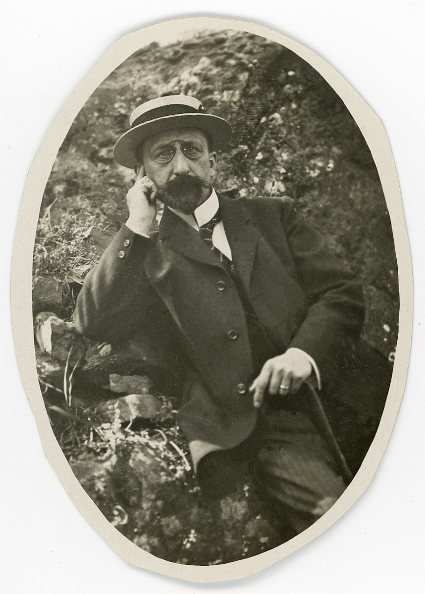 En äldre herre i kostym med väst, stärkkrage, pincené och halmhatt. Han sitter vid en stenmur som han lutar ena armen mot.
