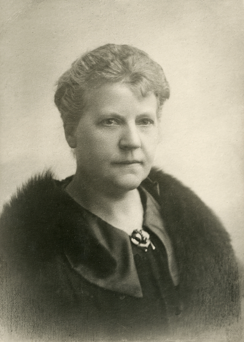 En medelålders kvinna i mörk klänning med dito pälsbrämad kappa. Mitt fram på klänningen syns en stor guldbrosch.