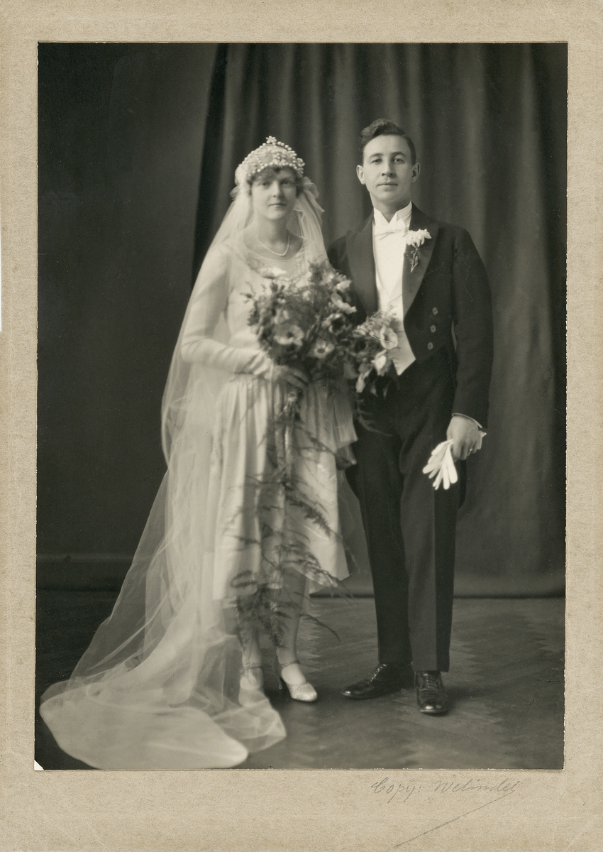 Ett brudpar hos fotografen. Bruden i knäkort vit brudklänning med slöja, brudgummen i frack med handskar.