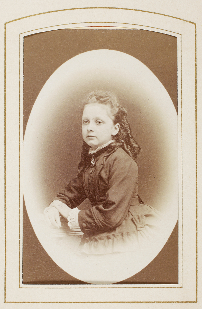 En flicka i mörk klänning med vit ryschkrage. Runt halsen syns ett mörkt sammetsband med en stor brosch.