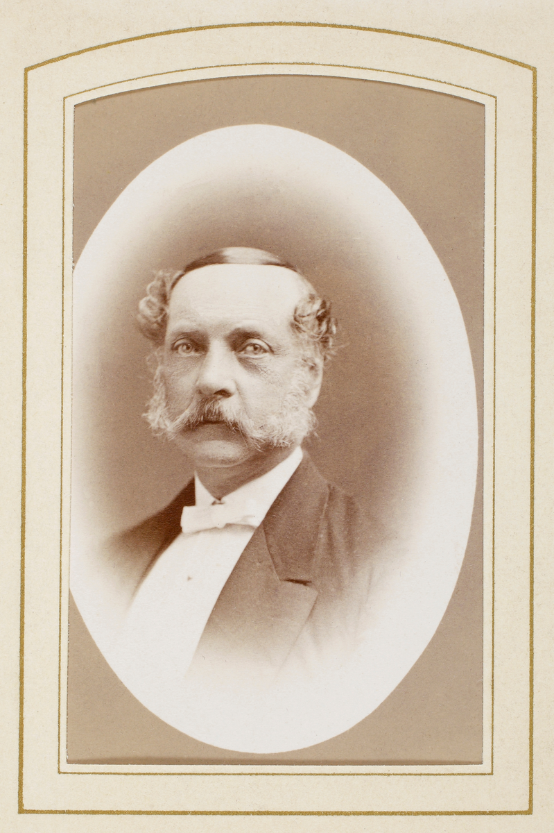 En man med mustascher och polisonger, klädd i frack med stärkkrage och fluga.