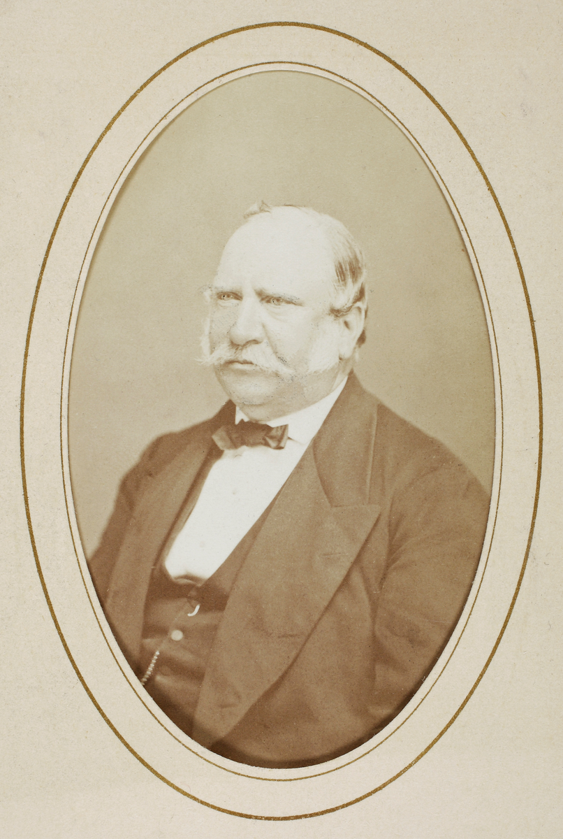 En medelålders vitskäggig man i bonjour med väst, stärkkrage och fluga.