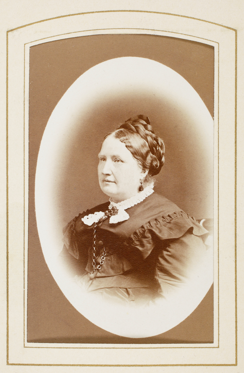 En kvinna i mörk sidenklänning med vit spetskantad krage och en brosch vid halsen.