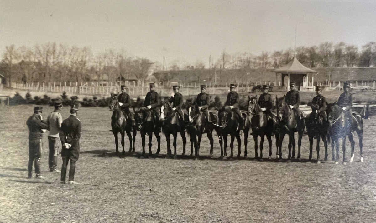 Smålands artilleriregemente, A 6. Fr v: löjtnanterna E L G Pantzerhielm och C W S Winberg, major greve F G H Wachtmeister (A 1). Till häst fr v: löjtnanterna G R Zandrén, R N A Årmann och S R A Palmborg, kaptenerna J Tengberg och S E Schreiber, löjtnanterna T Melander och C E Lallerstedt, löjtnant (res.) P A J J Ubbe, oidentifierad. Foto från c:a år 1915-1920.