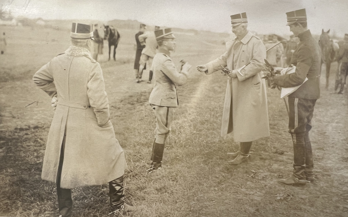 Smålands artilleriregemente, A 6. Hubertusjakt på övningsfältet. Prisutdelning. Fr v: överste P A L R Hammarskiöld (C A 6), löjtnant A J Philipson, överste Adlercreutz, löjtnant C W S Winberg. Foto från år 1920.