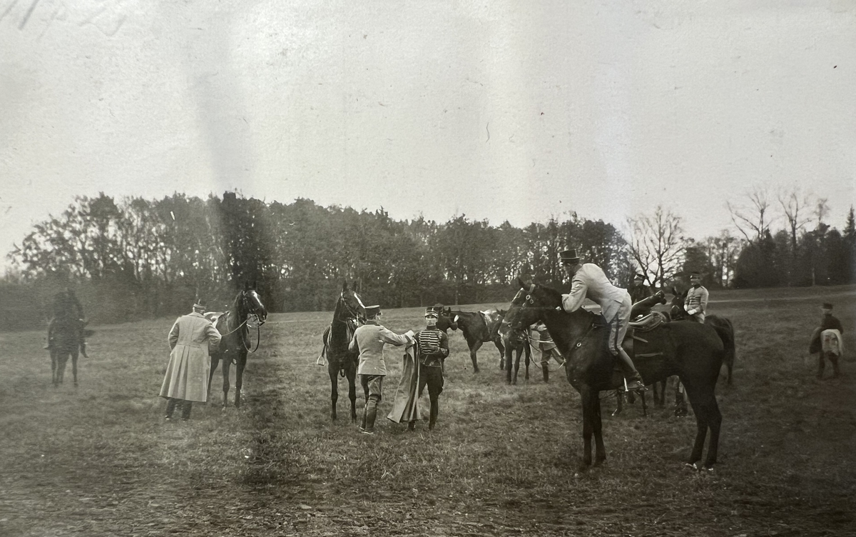 Smålands artilleriregemente, A 6. Hubertusjakt på övningsfältet. Efter målgång. Foto från år 1920.