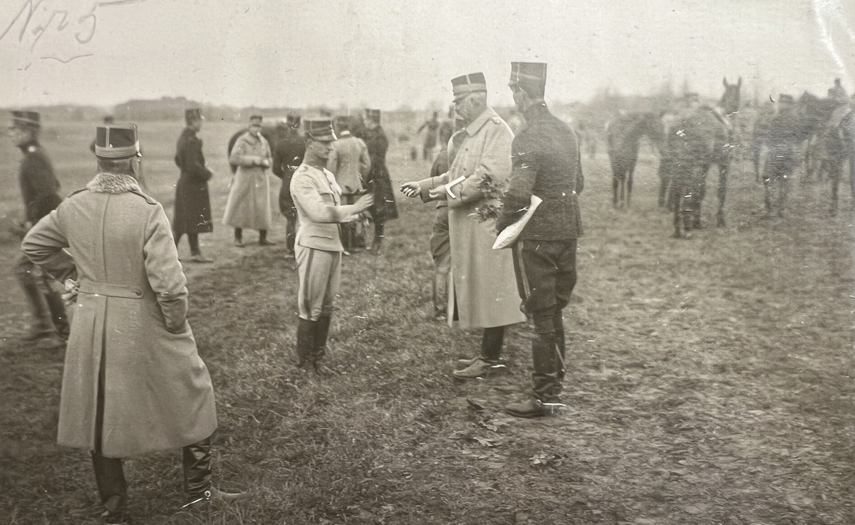 Smålands artilleriregemente, A 6. Hubertusjakt på övningsfältet. Prisutdelning. Fr v: överste P A L R Hammarskiöld (C A 6), oidentifierad, överste Adlercreutz, löjtnant C W S Winberg. Foto från år 1920.