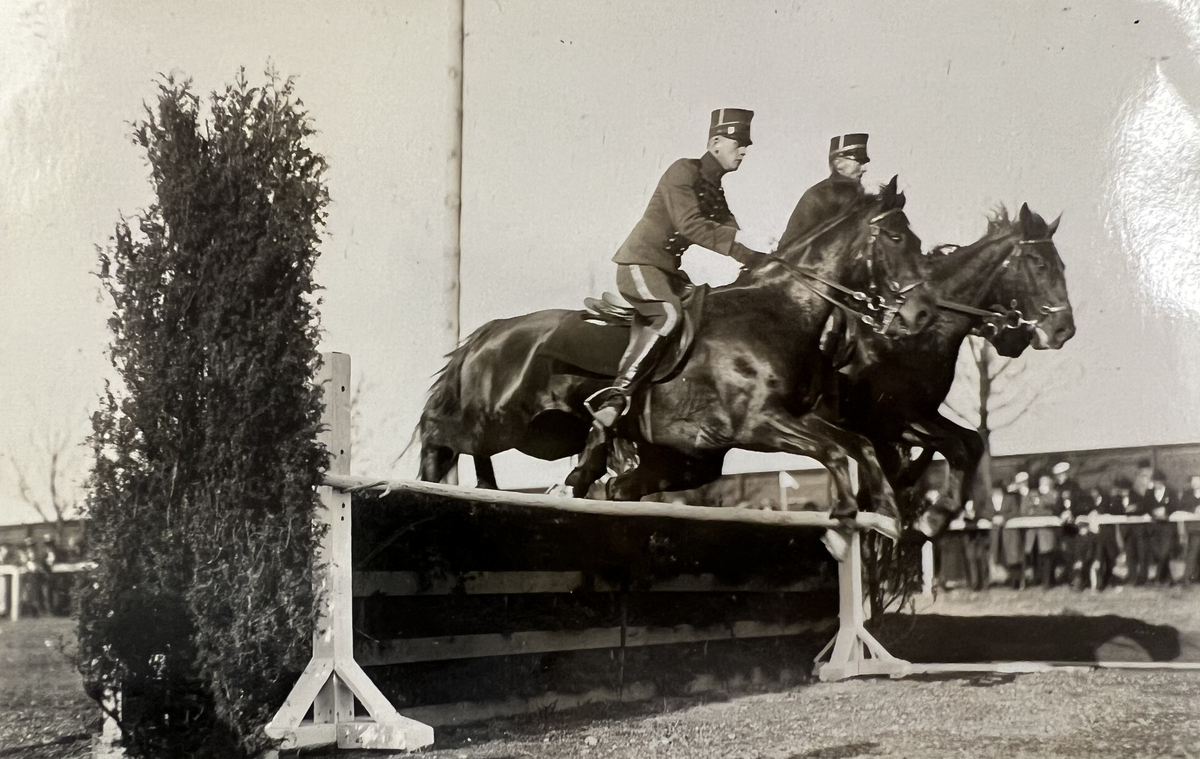 Smålands artilleriregemente, A 6. Fotot taget i Norrköping. Fr v underlöjtnant Jentzen på hästen "Egord", löjtnant G R Zandrén på hästen "Urban", underlöjtnant Ekstrand (skymd) på hästen "Diabolo". Foto från år 1924.