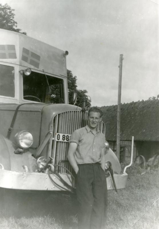 Svartvitt fotografi av en man som står och lutar sig mot fören på en lastbil. I bakgrunden, till höger i bild, syns en byggnad med halmtak och en telefonlednings- eller elstolpe.