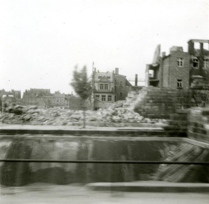 Svartvitt, suddigt fotografi av en stad i ruiner som troligen är taget i farten från ett fordon.