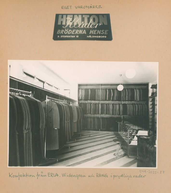 Interiört fotografi av Henses herrekipering på Södra Storgatan 13. På galgar hänger rockar och kostymer.