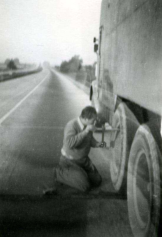 Svartvitt fotografi av en man som spänner bultarna på ett lastbilshjul. Lastbilen står parkerad längs en landsväg.