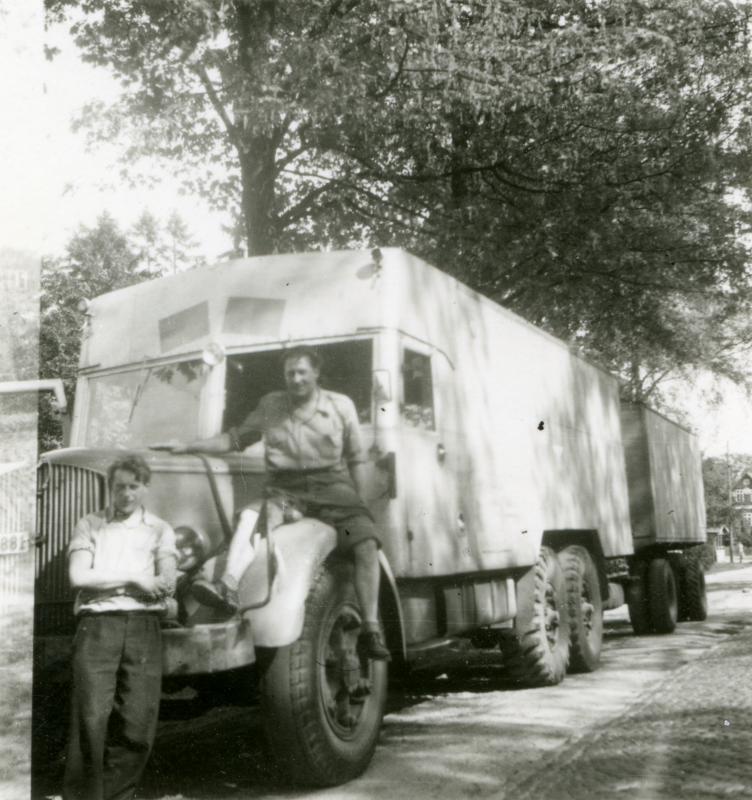 Svartvitt fotografi av två män, den ena sitter på stänkskärmen ovanför en lastbils framhjul. Den andre står framför lastbilen och lutar sig mot motorhuven.