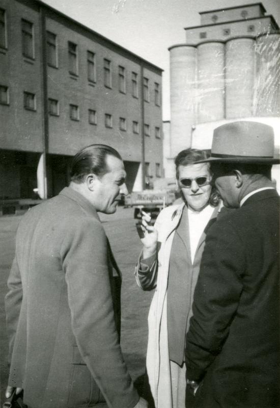 Svartvitt fotografi av två män, enligt bildtexten Lindgren till vänster och Axel Gusstusson till höger, och en kvinna, Lindgrens fru från Odense, som står vända mot varandra. Kvinnan har solglasögon och en cigarett i handen. I bakgrunden syns en trevåningsbyggnad och en hög silo.