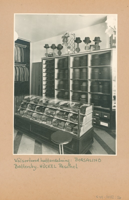 Interiört fotografi av Henses herrekipering på Södra Storgatan 13. I hyllan och på hyllan finns hattar för herrar.