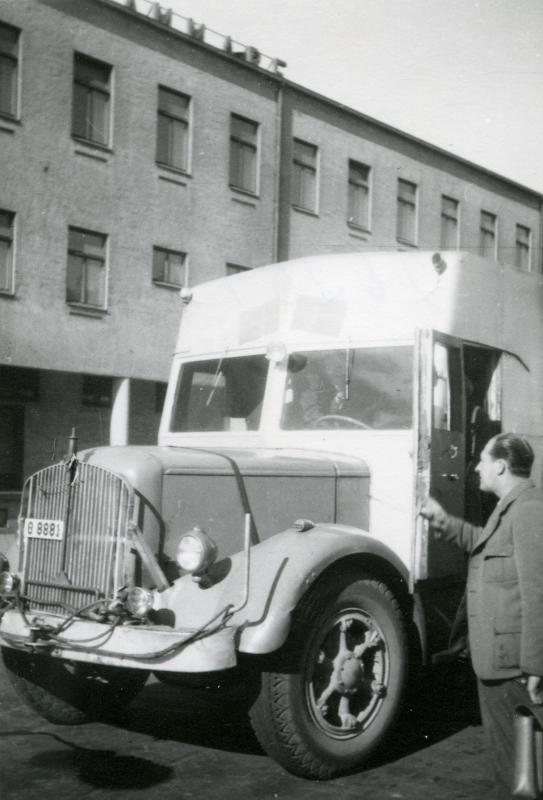 Svartvitt fotografi av en man som står intill en lastbil. I bakgrunden syns en trevåningsbyggnad.