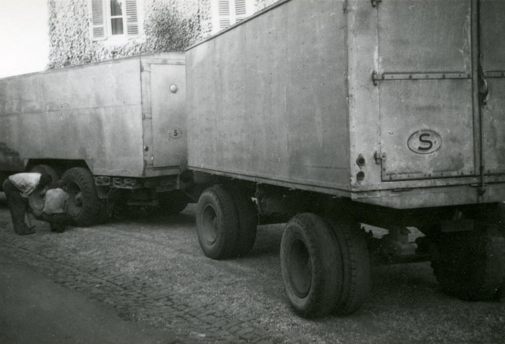 Svartvitt fotografi av två män intill en lastbil. Den ena mannen sitte på huk intill ett av hjulen. Den andre står, framåtlutad, bredvid honom. Båda tittar på hjulet. I bakgrunden syns en byggnad.