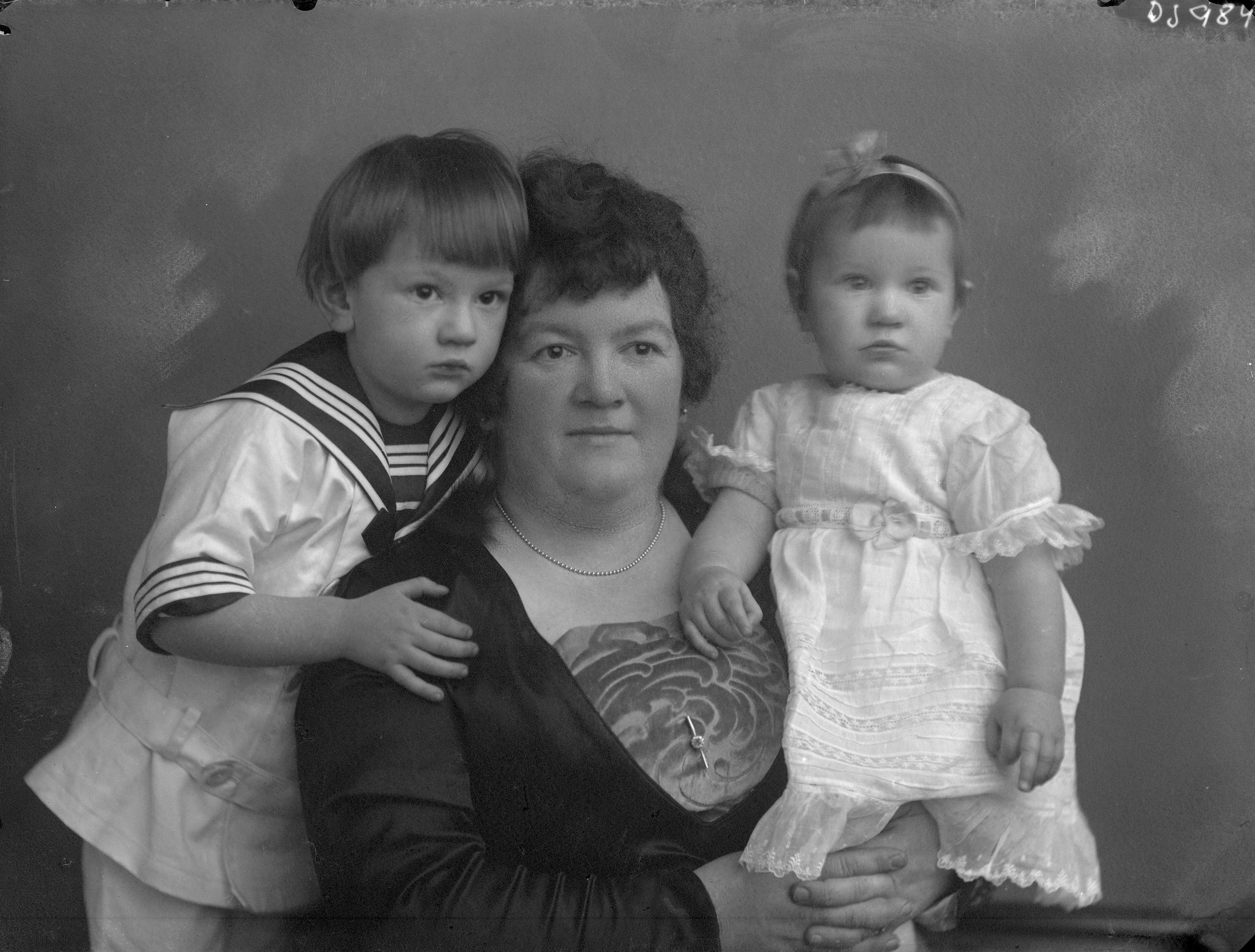 Fru Slaktare Ahlgren + 2 barn, Saluhallen Lilla Torg.