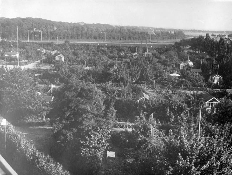fotografi, elledning, järnväg, väg, häck, skorsten, kolonistuga, träd, himmel, byggnad, flaggstång, hus