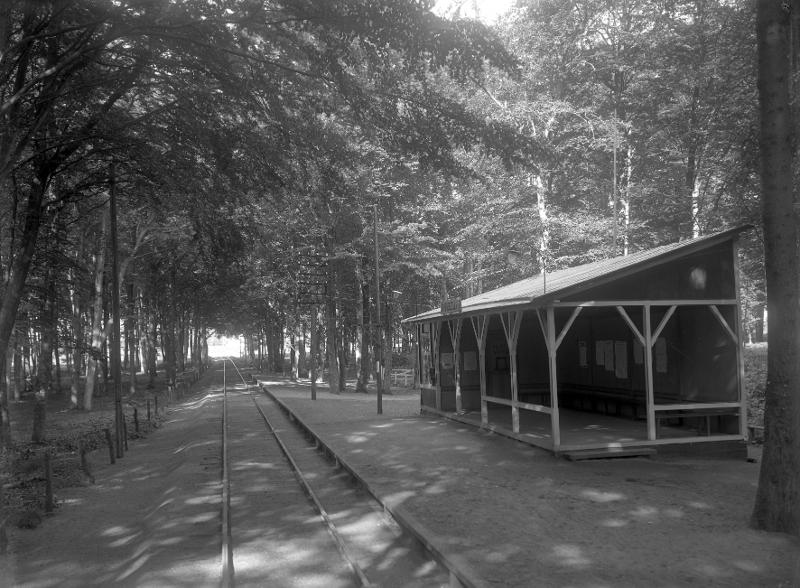 fotografi, informationsblad, byggnad, elledning, staket, järnväg, träd, hållplats